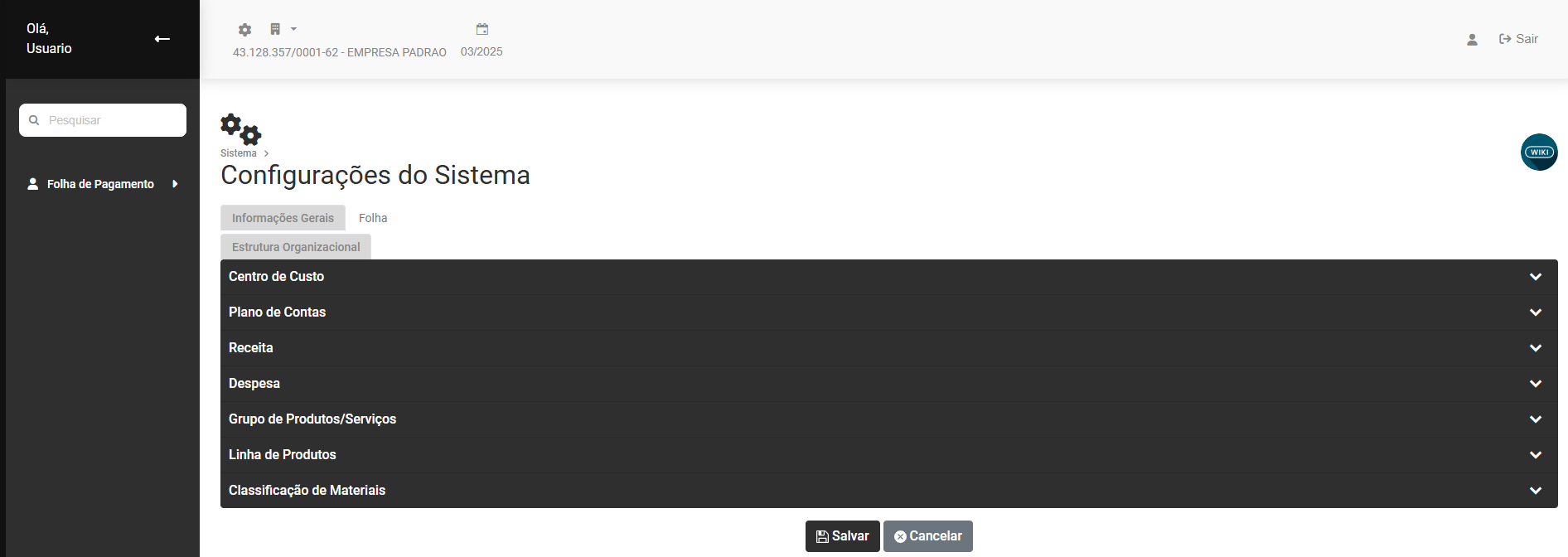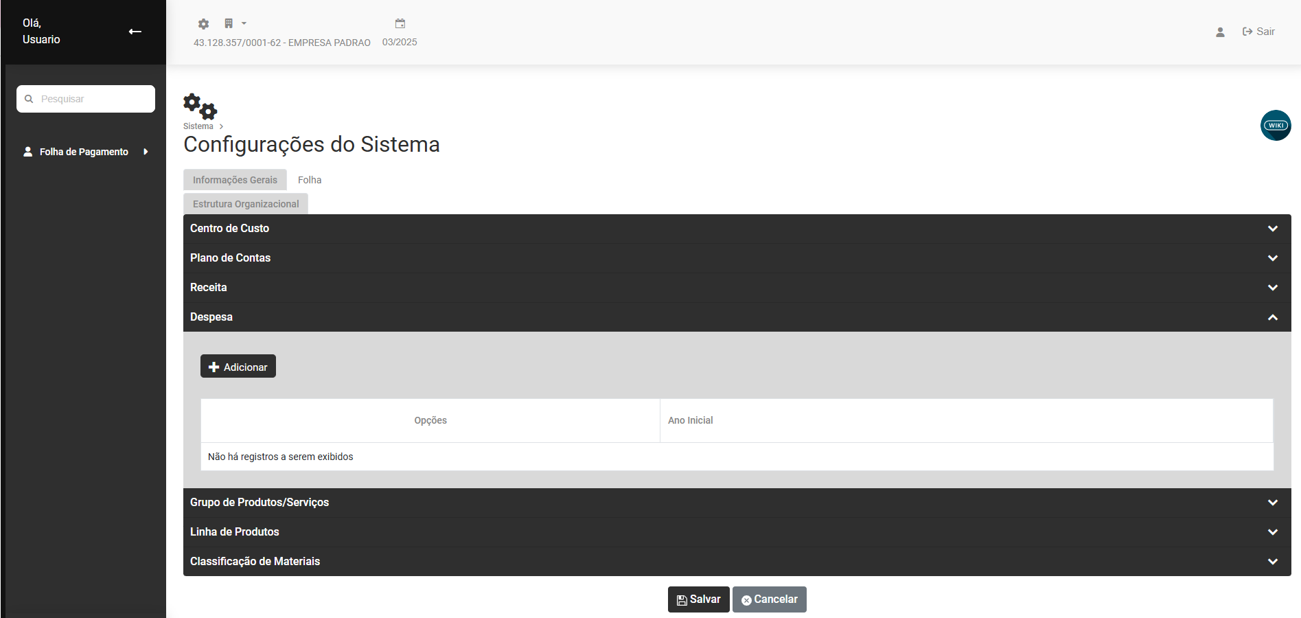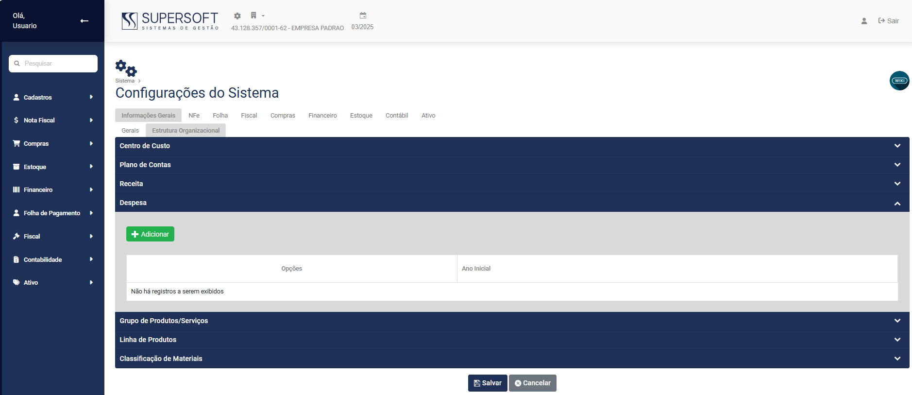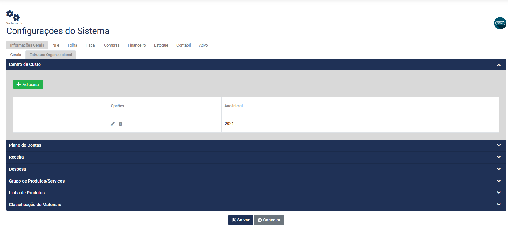 Cadastro das Configurações da Estrutura Organizacional e do Sistema Fiscal