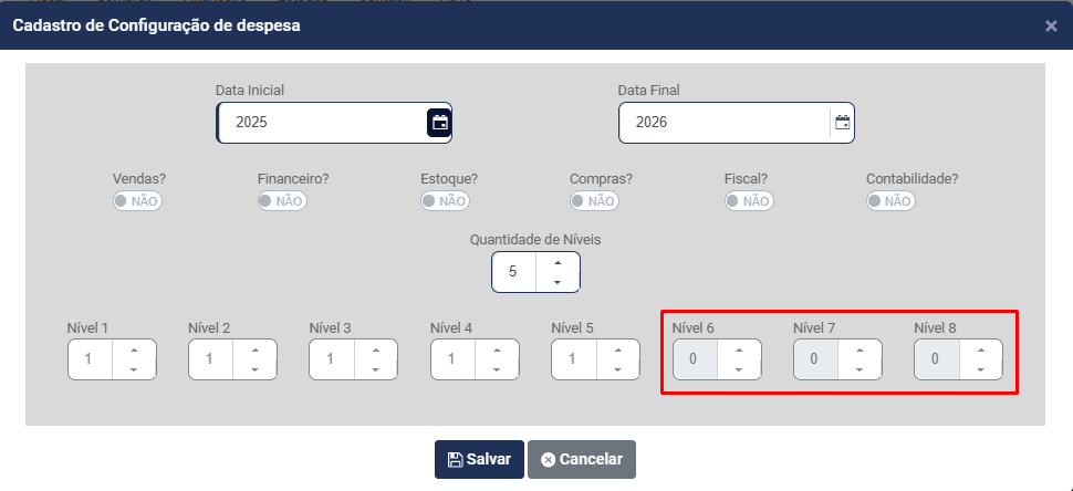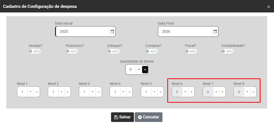 Quando você não define a quantidade total de níveis disponível (8), o próprio Módulo impede a indicação de quantidade de níveis e caracteres dos níveis que não serão utilizados