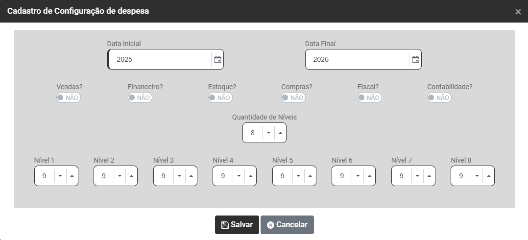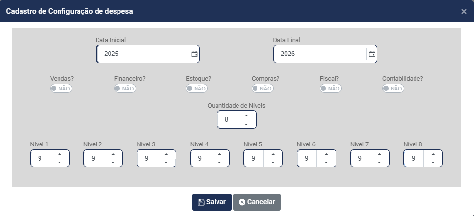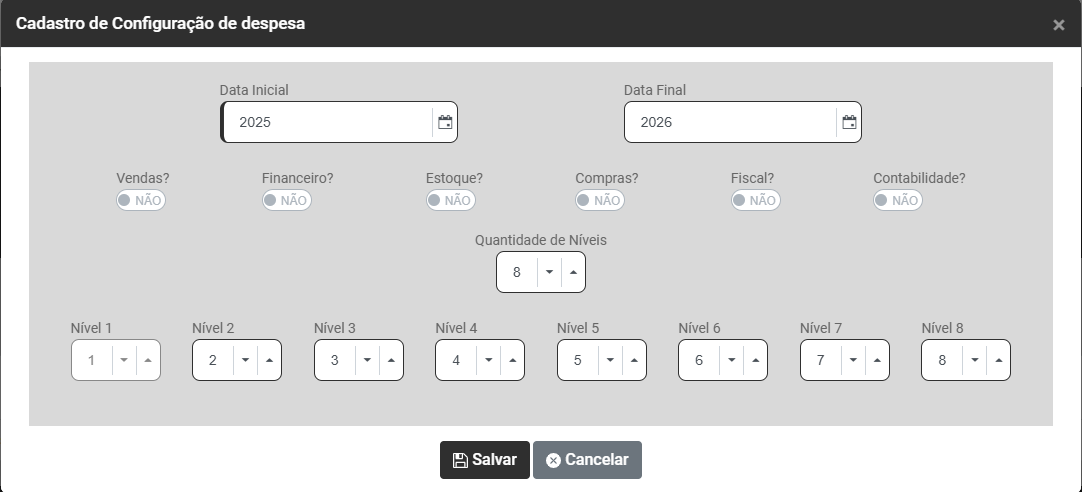 d) Informe quantos Níveis terá a Estrutura da Despesa - Você conseguirá definir até 8 níveis para composição da Despesa