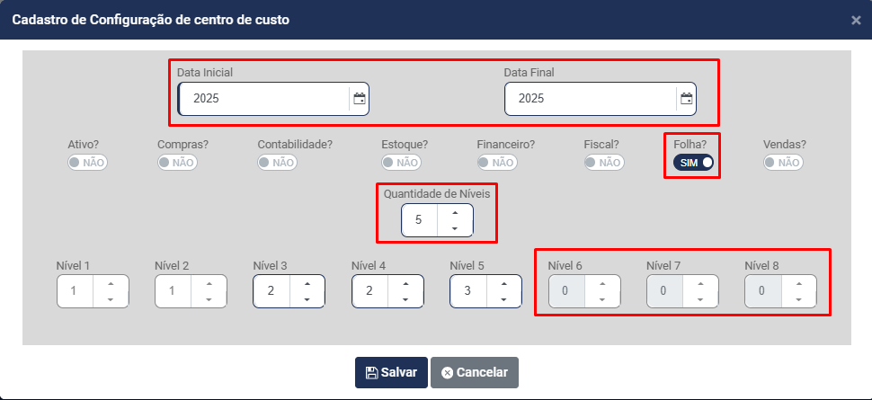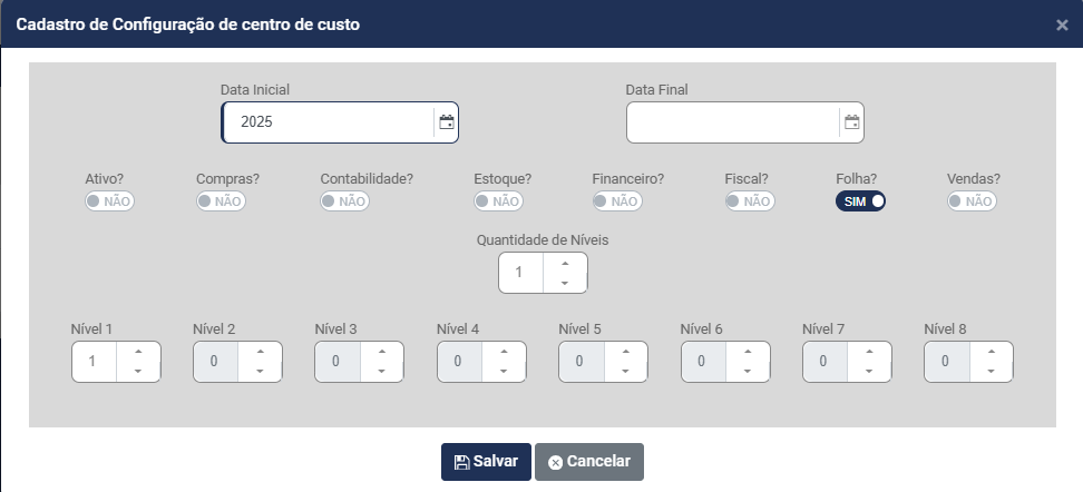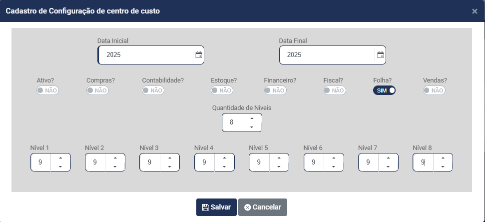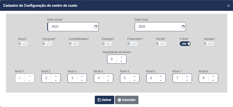 d) Informe quantos Níveis terá a Estrutura do Centro de Custo - Você conseguirá definir até 8 níveis para composição do Centro de Custo