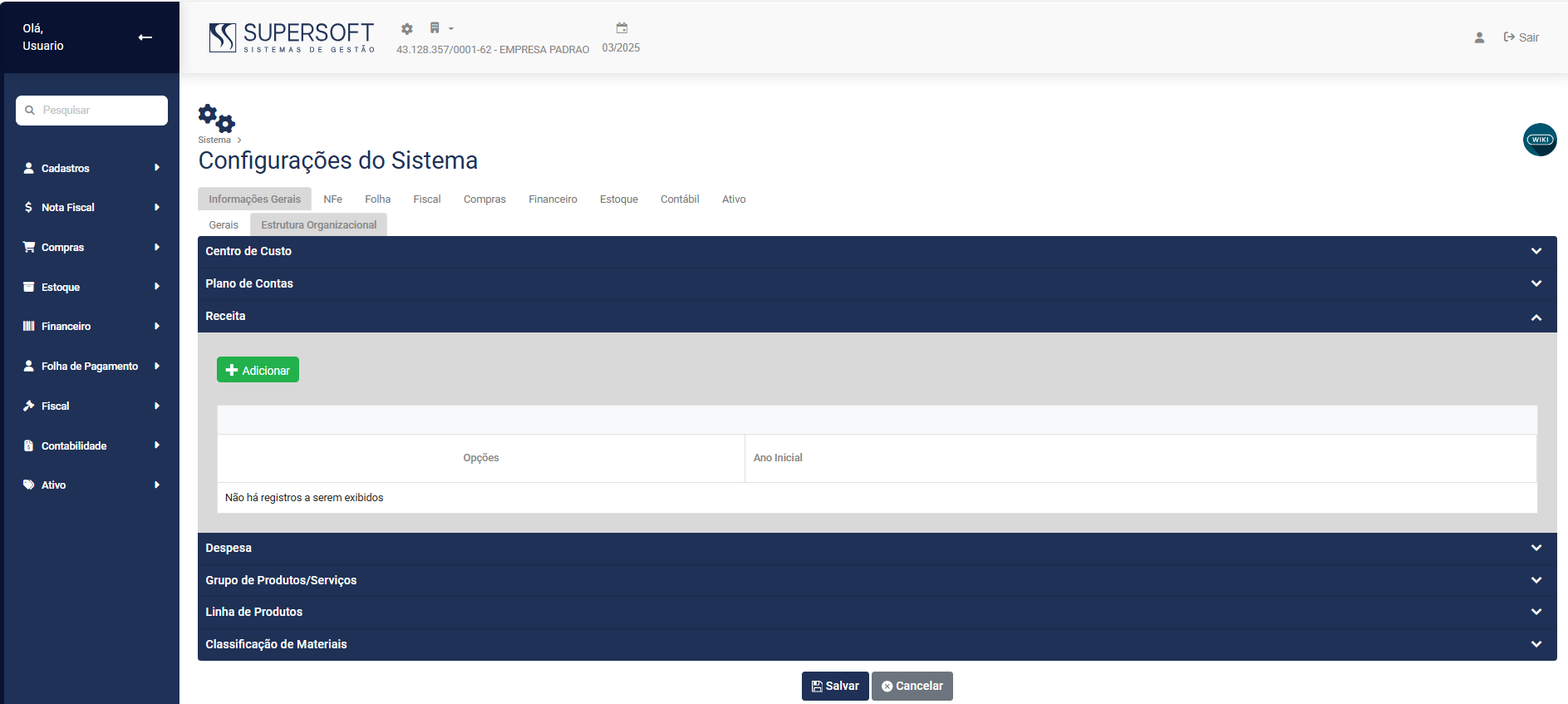 Desta forma é IMPORTANTE SALIENTAR QUE - A partir do momento que você definir a utilização de Receita e fizer uso da mesma, o Módulo irá exigir essa informação em todas as movimentações realizadas dentro da data estipulada, sendo possível deixar de utilizar o Receita apenas a partir do Ano informado no Campo Data Final