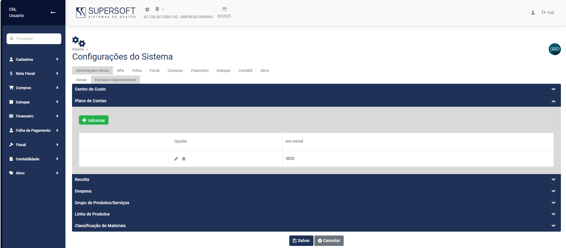 Clique no Botão Adicionar para definir a utilização de Plano de Contas e para determinação da Estrutura do mesmo