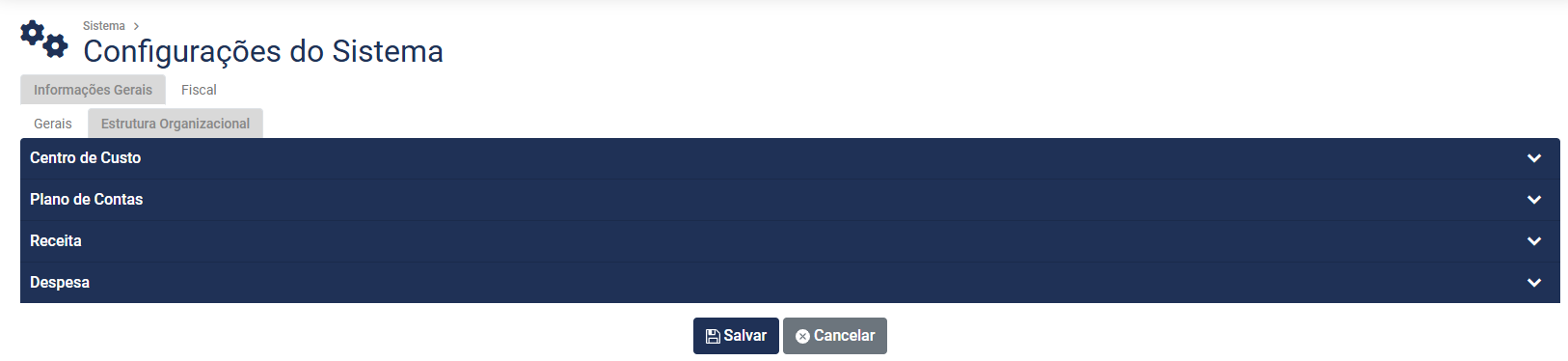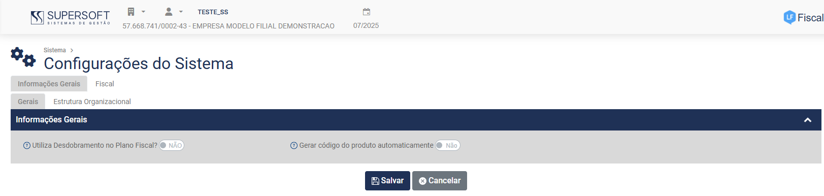 As Configurações do Sistema está dividida em duas abas (Gerais/Estrutura Organizacional e o Módulo Fiscal) e na aba Informações Gerais/Estrutura Organizacional você irá definir Configurações que serão utilizadas em todos os Módulos do Sistema