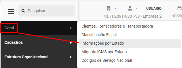 Para cadastrar as Informações Por Estado da Empresa, acesse o menu Geral>Informações Por Estado