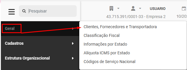 Para cadastrar Pessoas, você deverá acessar o menu Geral>Clientes, Fornecedores e Transportadora