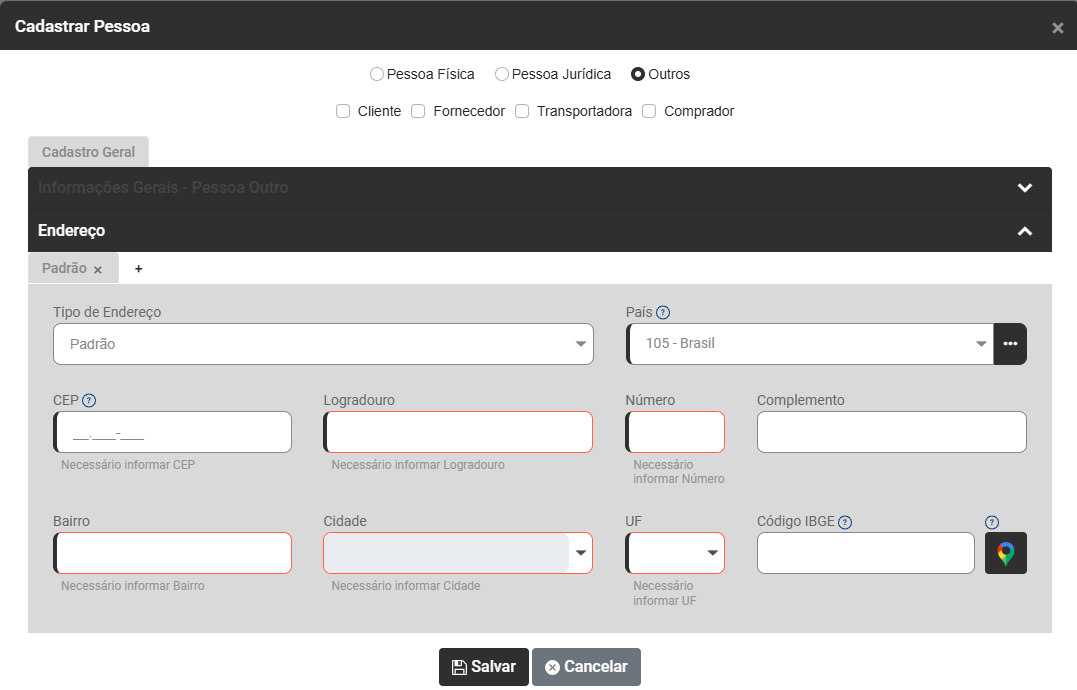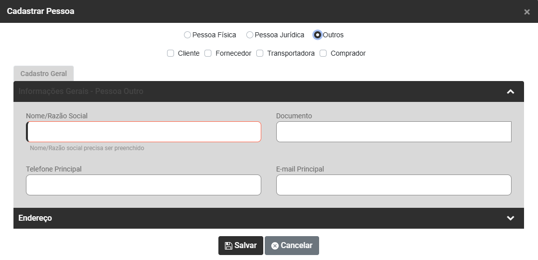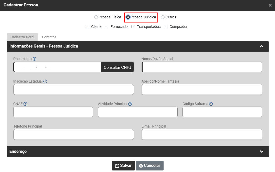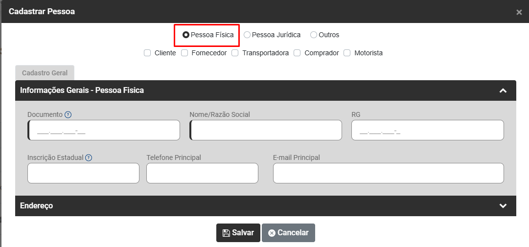 Cadastro de Clientes, Fornecedores, Transportadoras, Compradores e Motoristas (Pessoa Física, Jurídica ou Outras)