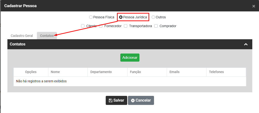Quando você define Pessoa Jurídica o Sistema habilita também a aba Contatos, clique no botão Adicionar e defina