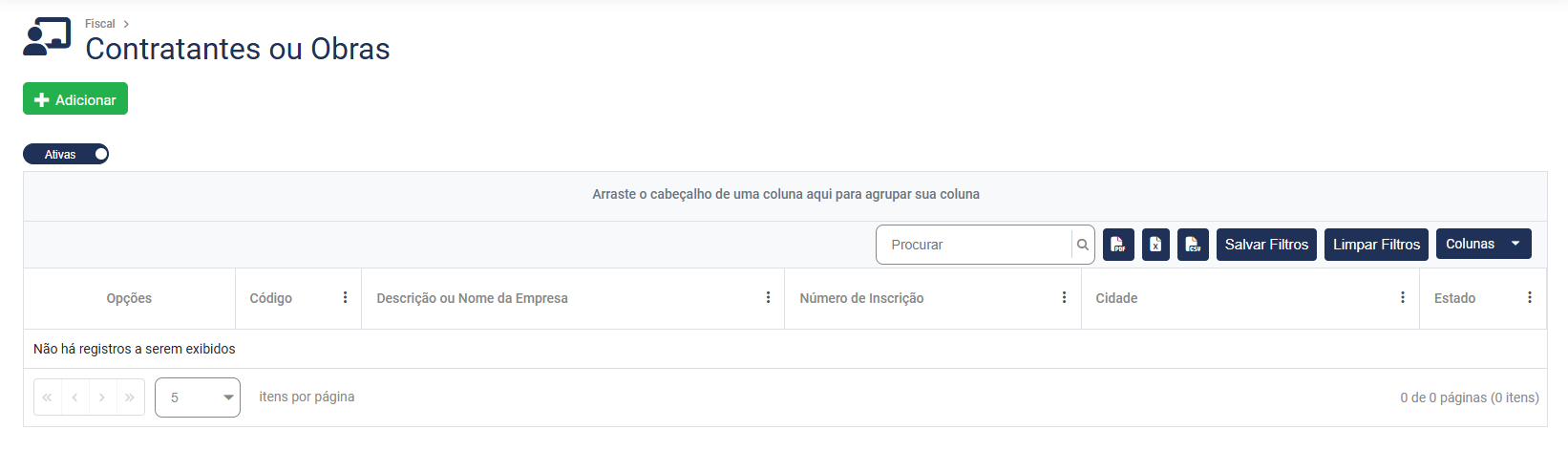 Para cadastrar o Contratante ou Obra acesse o botão Adicionar, existente na parte superior esquerda da tela