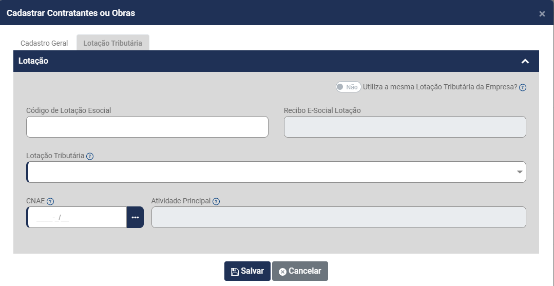 - Utiliza a mesma lotação tributária da empresa - Ao selecionar esta opção sistema irá assumir as configurações da lotação da empresa vigente no período definido. Sempre que houver uma alteração na lotação da empresa estes dados serão alterados automaticamente para esta obra/contratante.