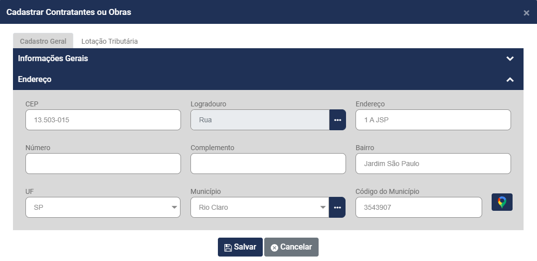 - CEP - quando você definir o CEP, os campos Logradouro, Endereço, Bairro, UF, Município e Código do Município serão preenchidos automaticamente