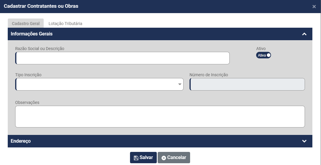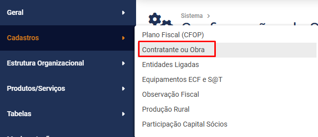 Se houver necessidade de você cadastrar Contratante ou Obra para a sua Empresa, acesse o menu Cadastros>Contratante ou Obra