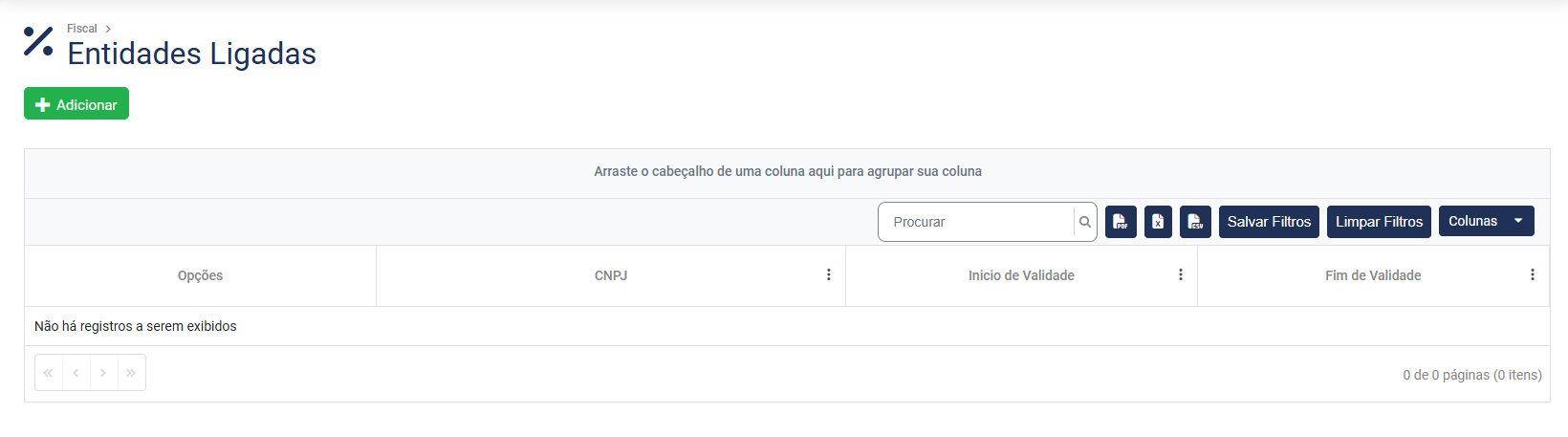Para cadastrar a Entidade Ligada, acesse o botão Adicionar existente na parte superior esquerda da tela