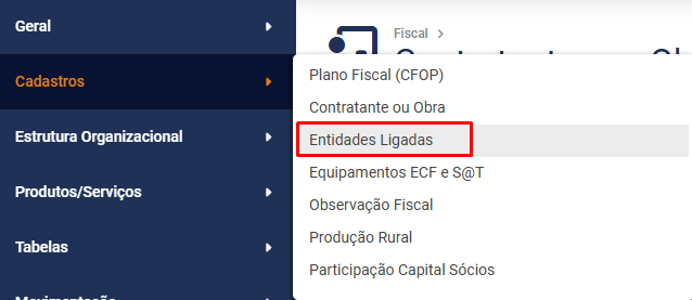 Para cadastrar as Entidades Ligadas, acesse o menu Cadastros>Entidades Ligadas