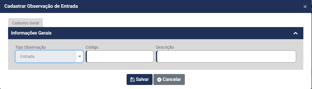 Será apresentada a tela  de Cadastro de Observação de Entrada, defina:
