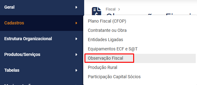 Para cadastrar as Observações Fiscais acesse o menu Cadastros>Observação Fiscal