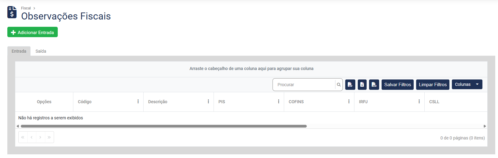 Para cadastrar Observação Fiscal de Entrada, clique na aba Entrada e em seguida no Botão Adicionar Entrada
