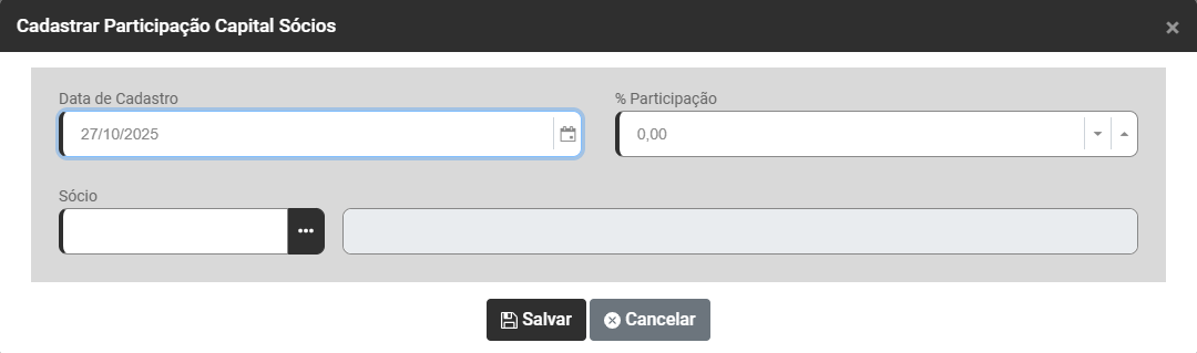 O Sistema apresentará a tela de Cadastro da Participação Capital Sócios, informe: