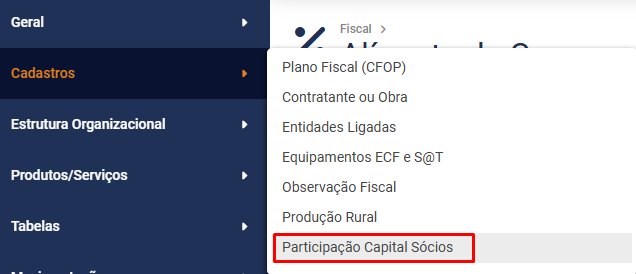Para cadastrar a Participação dos Sócios no Capital Social da Empresa acesse o menu Cadastros>Participação Capital Sócios