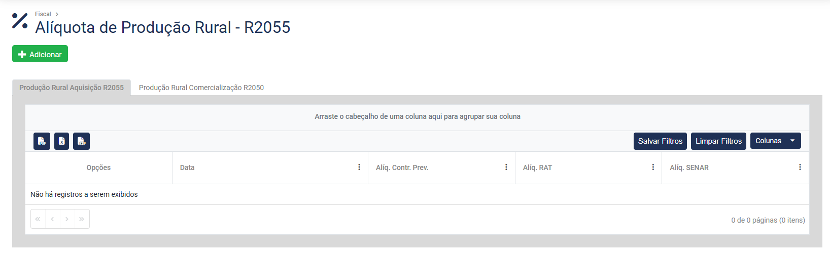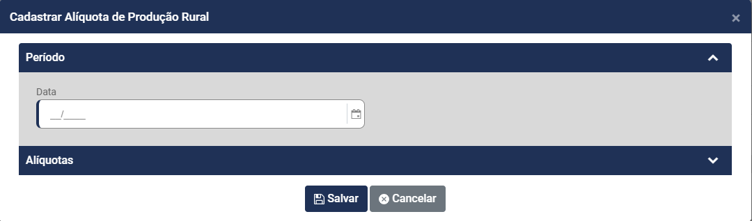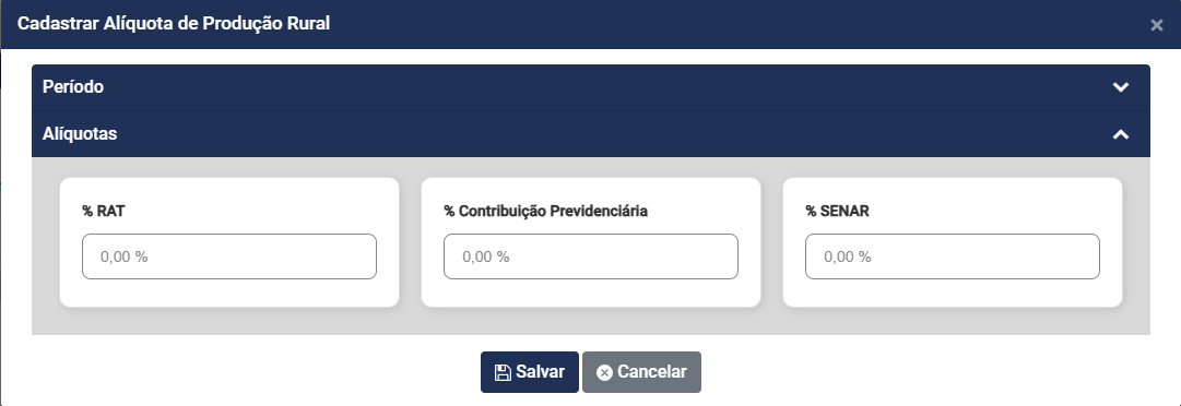 O Sistema trará a tela de Cadastro da Alíquota de Produção Rural, contendo: