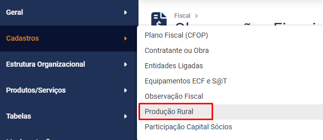 Para cadastrar a Produção Rural, acesse o menu Cadastros>Produção Rural