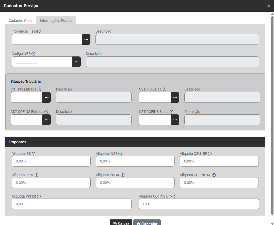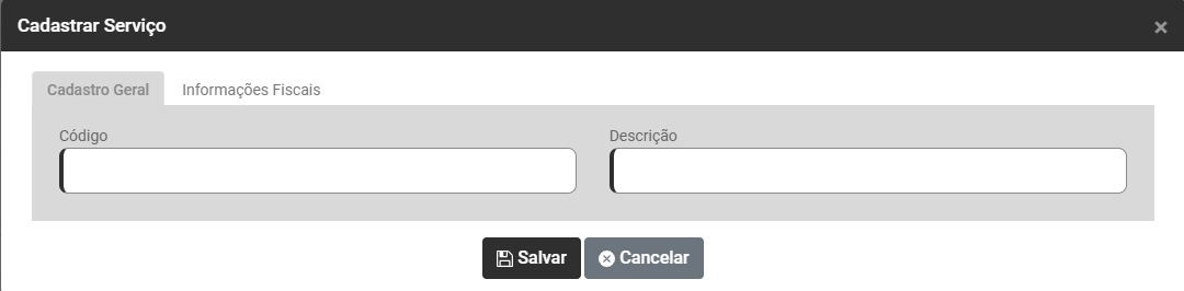 Ao ser acionado, o Sistema abrirá a tela de Cadastro de Serviço, com duas abas