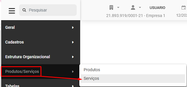 Para cadastrar os Serviços Prestados por sua Empresa, acesse o menu Produtos/Serviços>Serviços