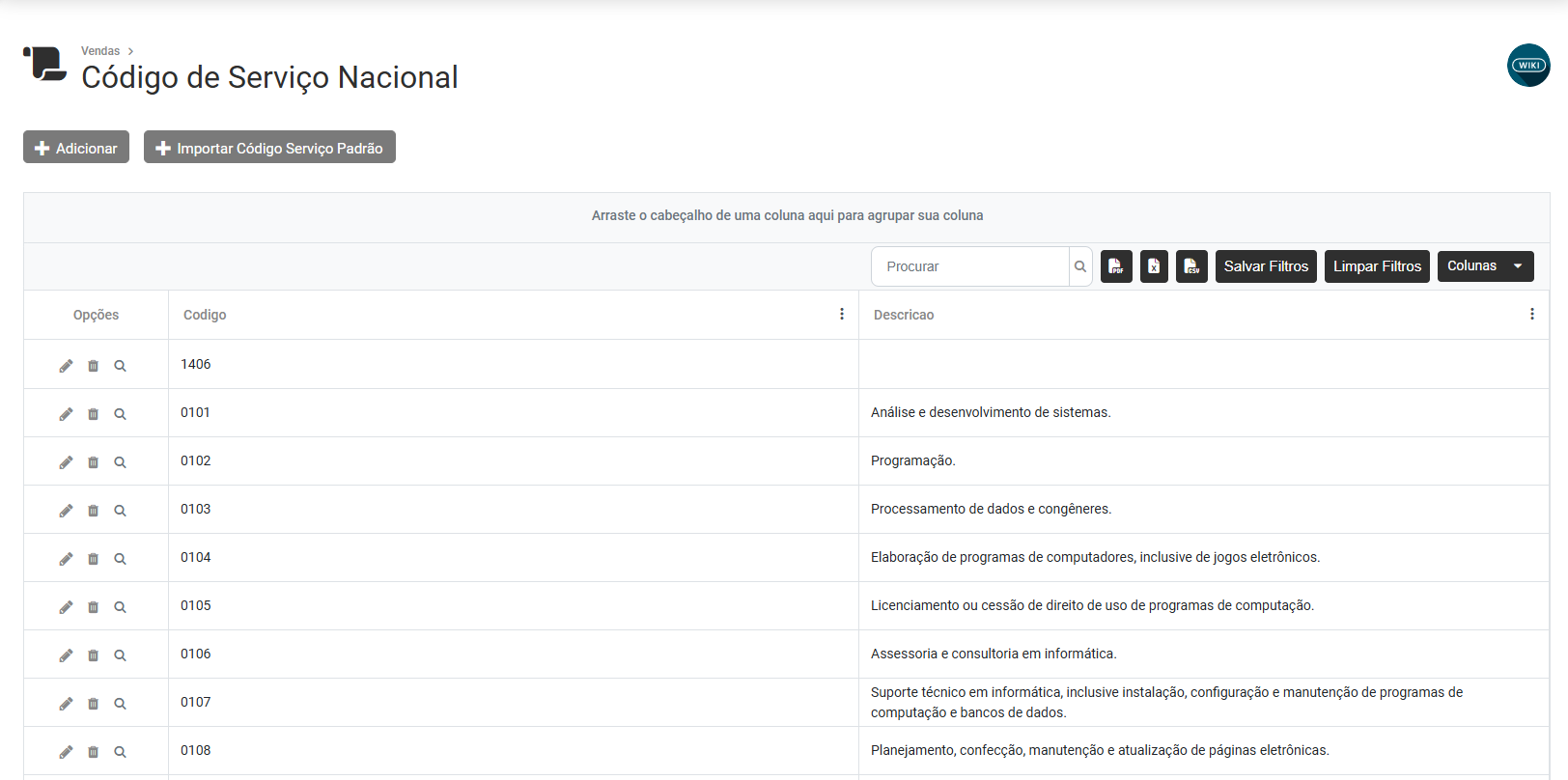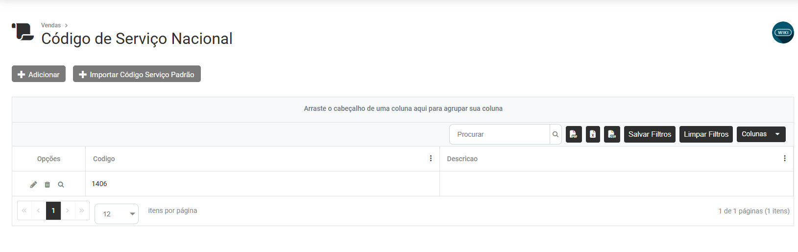 Na parte superior da tela você encontrará 2 botões - Adicionar e Importar Código Serviço Padrão
