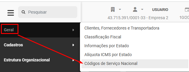 Para cadastrar os Serviços Nacionais (CSN) acesse o menu Geral>Códigos de Serviço Nacional