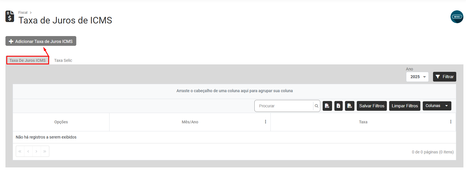 Ao acessar a aba Taxa de Juros ICMS você encontrará na parte superior da tela, o botão "Adicionar Taxa de Juros ICMS"