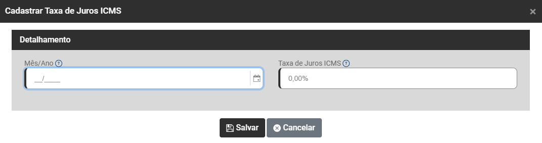 Ao clicar no botão, você deverá informar o Mês/Ano de referência e a Porcentagem da Taxa de Juros do ICMS