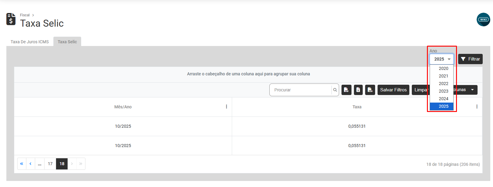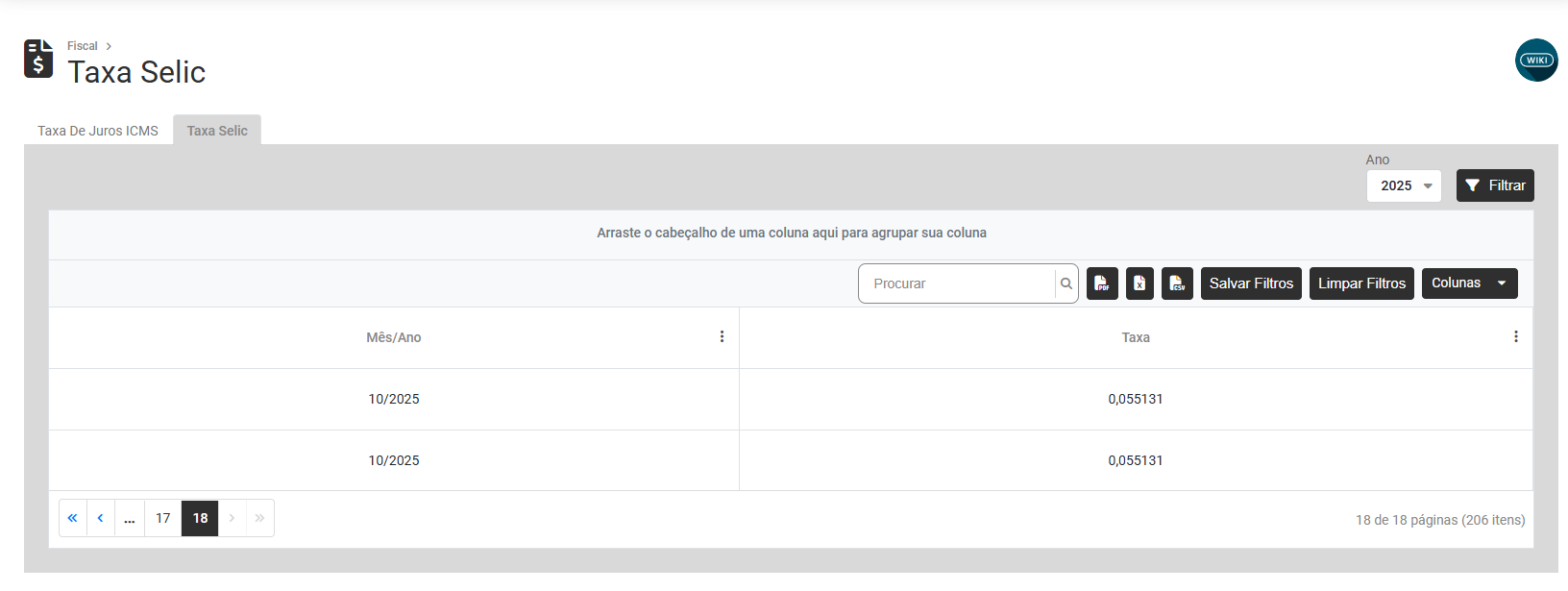 Ao acessar a aba Taxa Selic você encontrará a tabela com as taxas Selic previamente cadastrada
