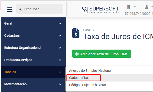 Para que você cadastre as Taxas de Juros de ICMS e Taxa Selic, acesse o menu Tabelas>Cadastro de Taxas