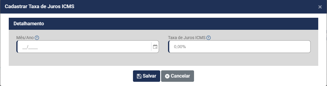 Ao clicar no botão, você deverá informar o Mês/Ano de referência e a Porcentagem da Taxa de Juros do ICMS