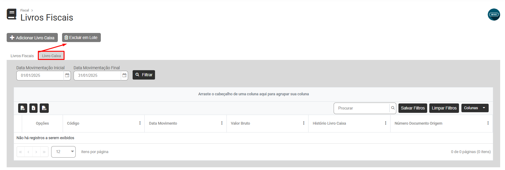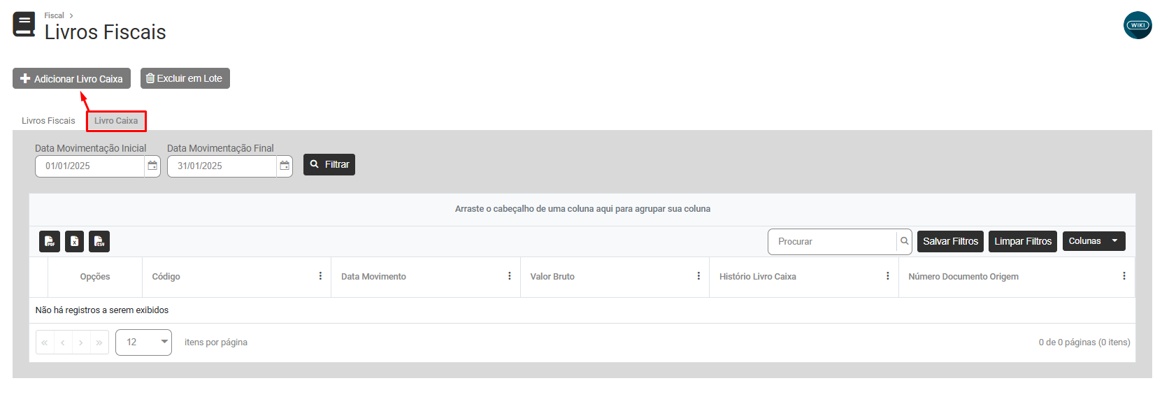 Ao acessar a ABA LIVRO CAIXA, será apresentada na parte superior da tela os botões