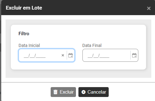 Ao acessar o botão, o Sistema apresentará a tela para que você informe a Data Inicial e Data Final das Notas de Serviços Prestados que deverão ser excluídas dos Livros de Serviços Prestados