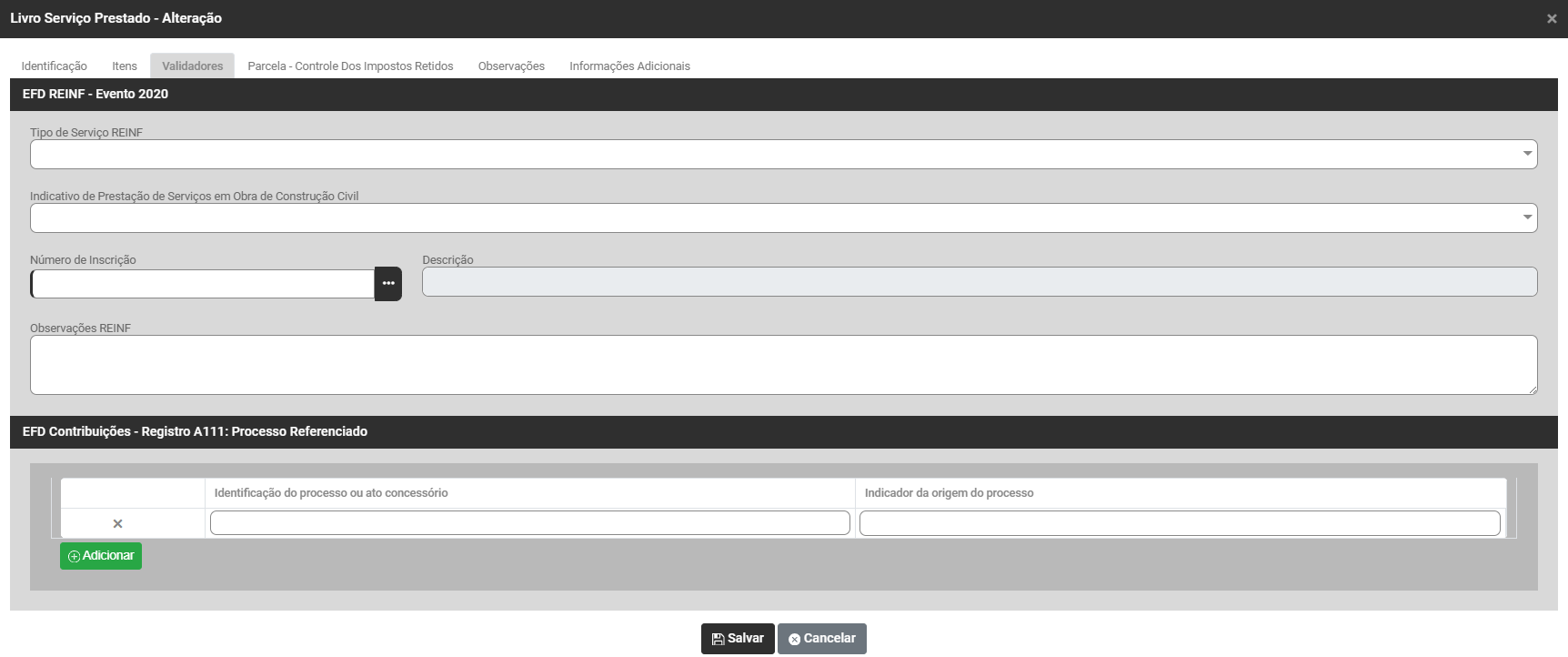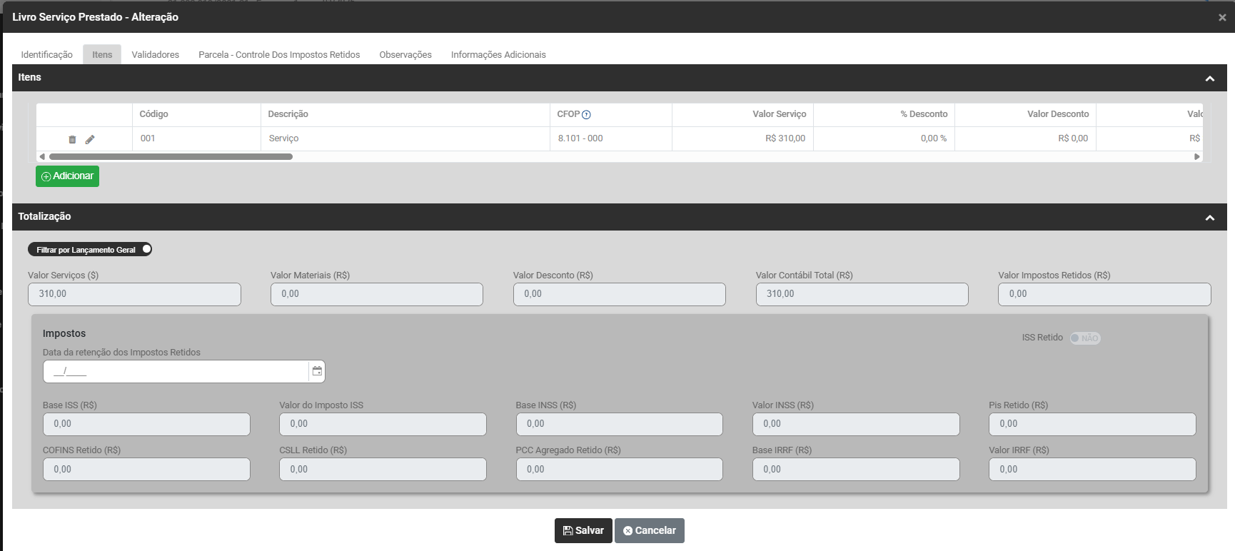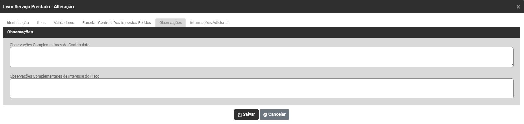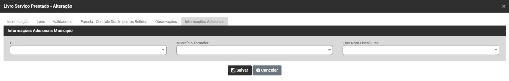 Ao acessar o Botão, o Sistema apresentará a tela para cadastro do Livro de Serviços Prestados com as abas:
