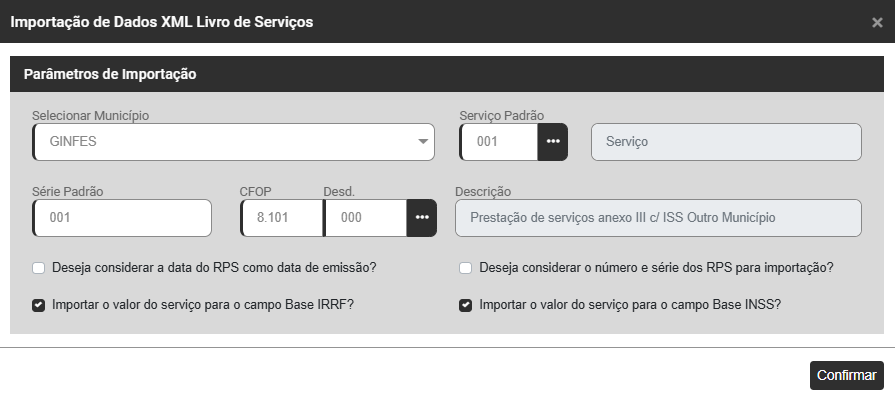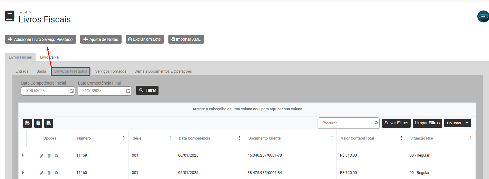 Cadastro do Livro Fiscal de Prestação de Serviços