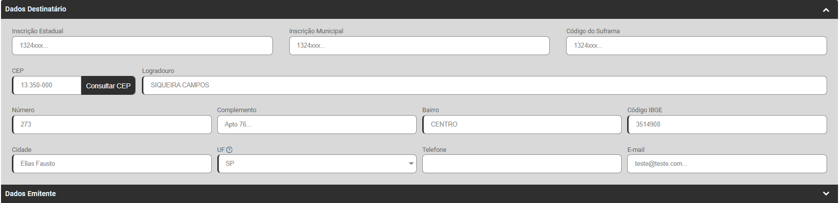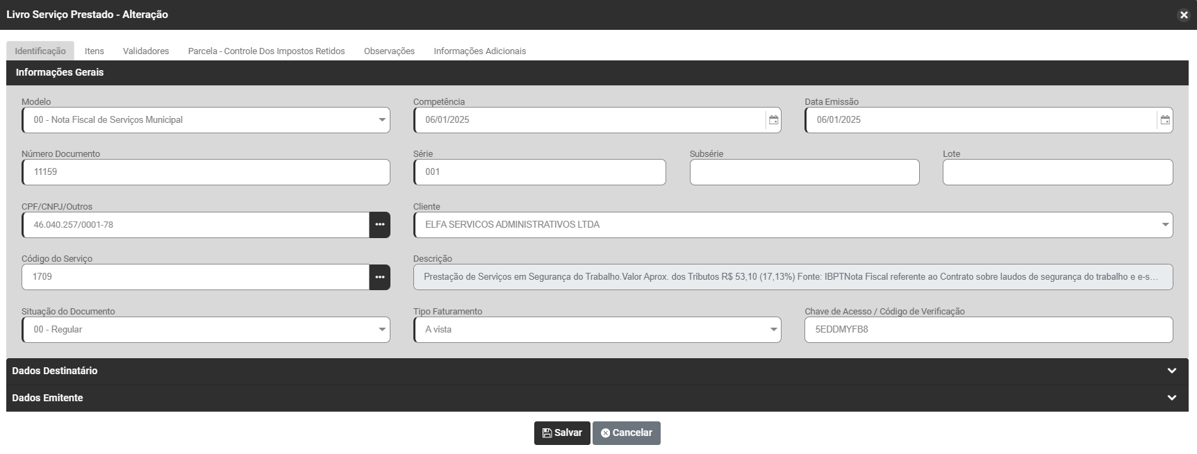 Em identificação, você deverá informar todos os dados da Nota Fiscal de Serviços Prestados que está sendo cadastrada, dados do Destinatário e Dados do Emitente