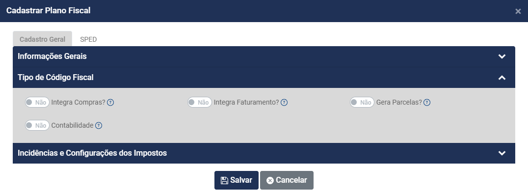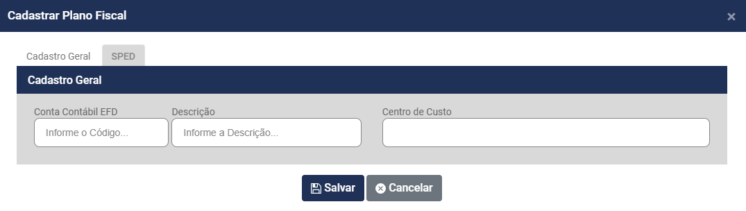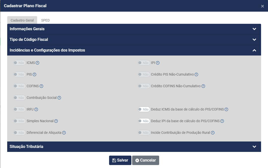 Na parte superior da Tela você encontrará 3 formas para o cadastro do Plano Fiscal de sua Empresa