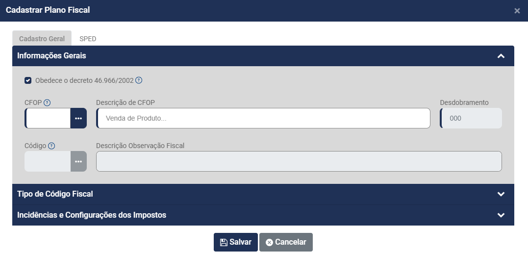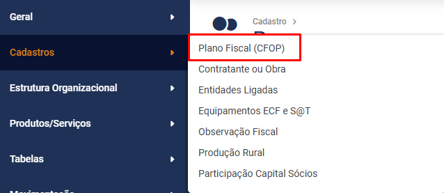 Para cadastrar o Plano Fiscal de sua Empresa, contendo os CFOPs que são utilizados, acesse o menu Cadastros>Plano Fiscal (CFOP)