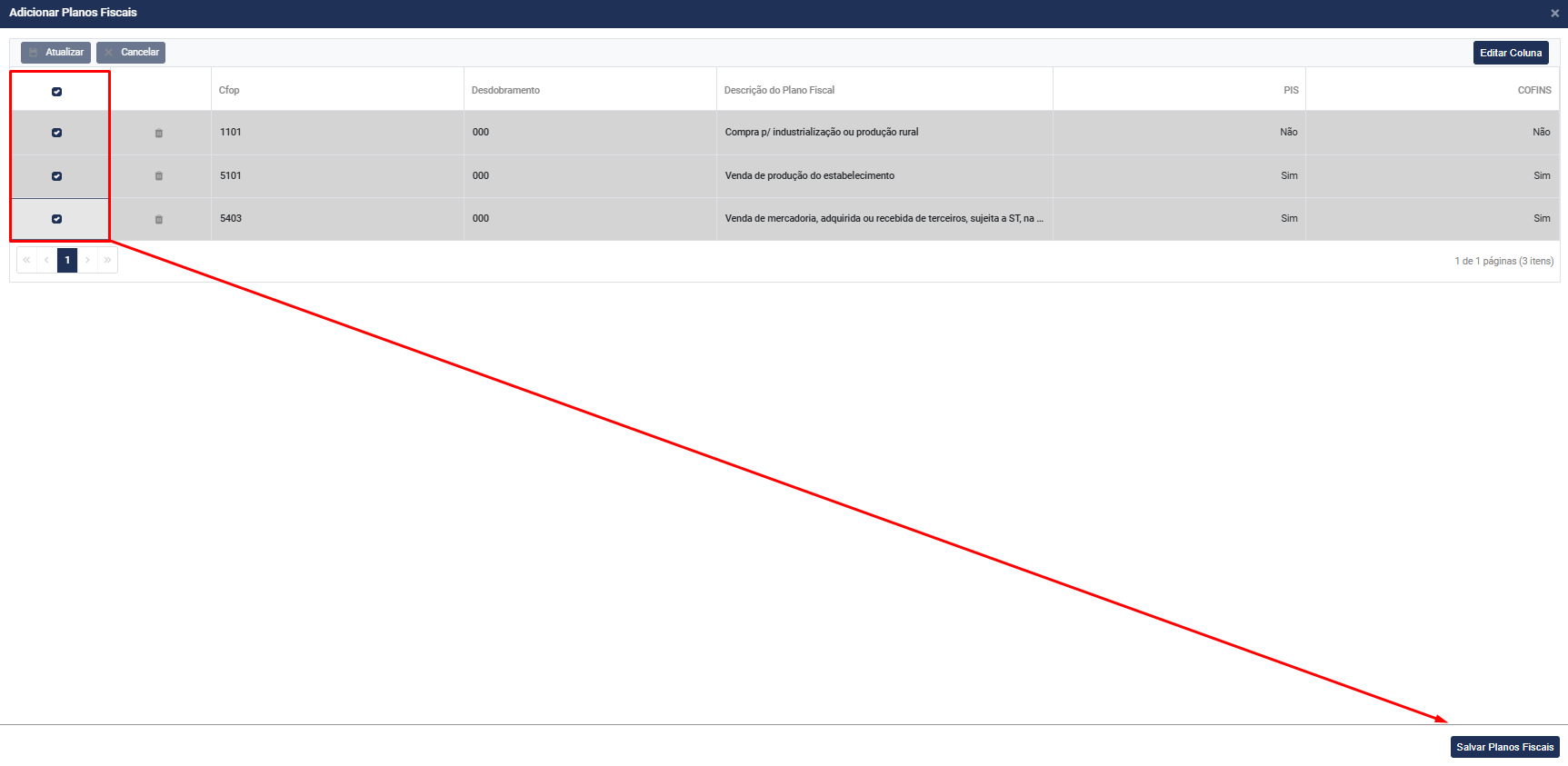 O Sistema apresentará a lista dos CFOPs que você selecionou anteriormente,, confirme selecionando os CFOPs e clique em Salvar Planos Fiscais