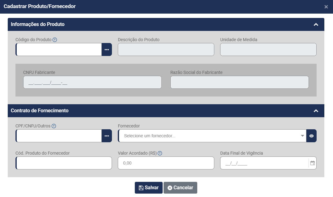 Ao acessar o botão será apresentada a tela para que você realize o cadastro de vínculo de Produtos/Fornecedores, informe
