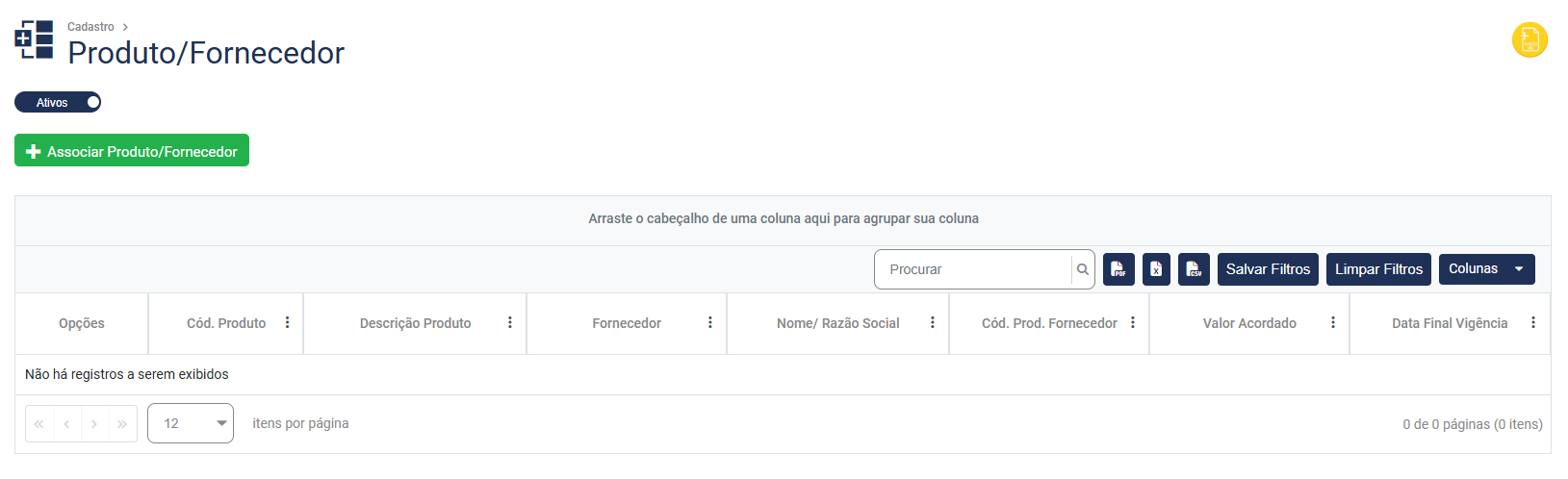 Na parte superior da tela você encontrará o botão Associar Produto/Fornecedor