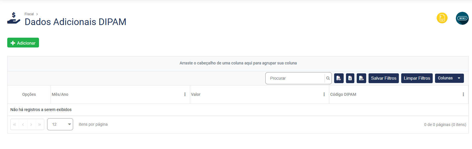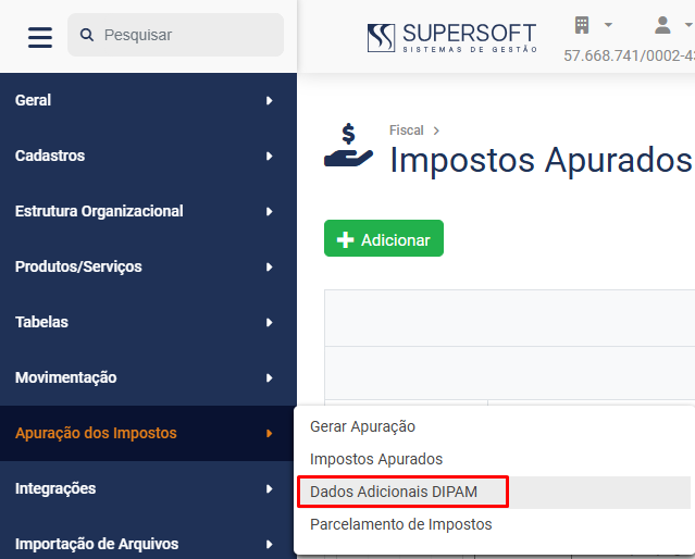 Para cadastrar os Dados Adicionais da DIPAM (Declaração para o Índice de Participação dos Municípios), acesse o menu Apuração dos Impostos>Dados Adicionais DIPAM