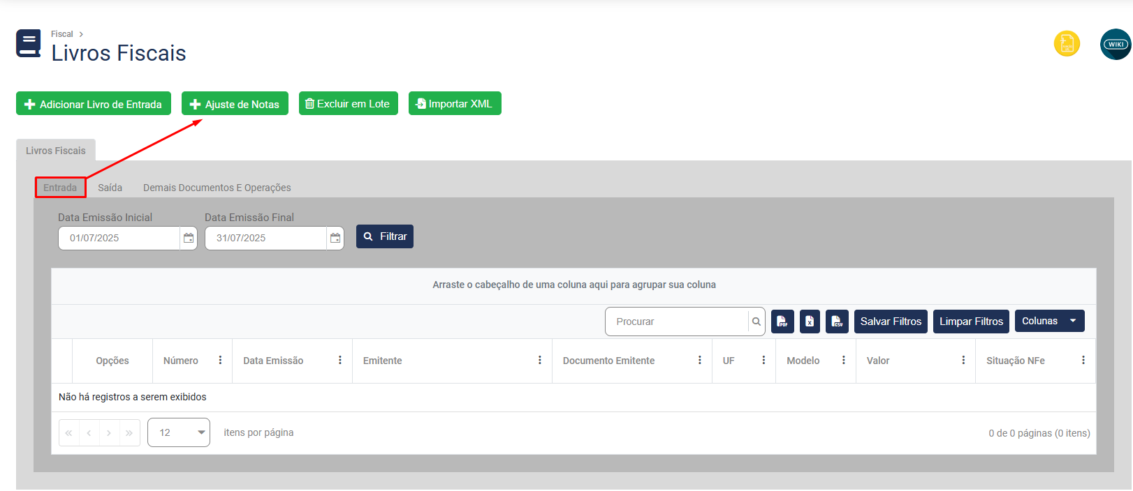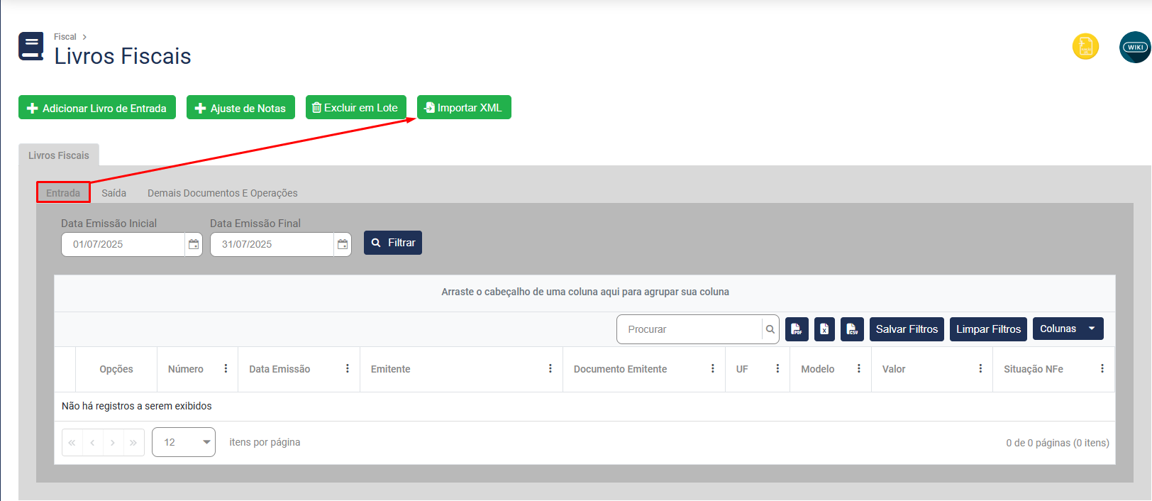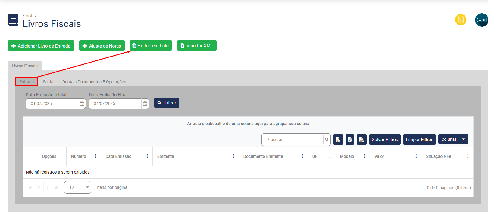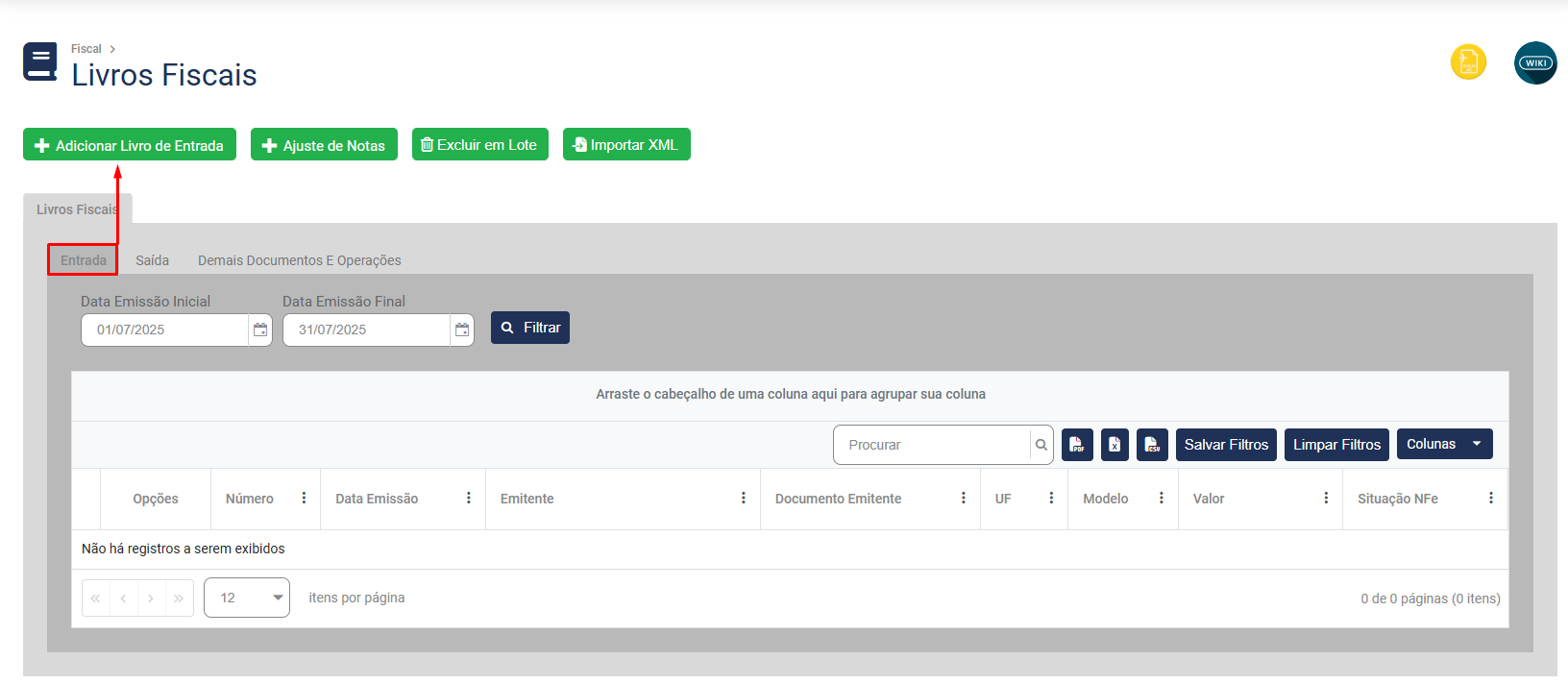 Ao acessar a Aba Entradas, será apresentada na parte superior da tela os botões