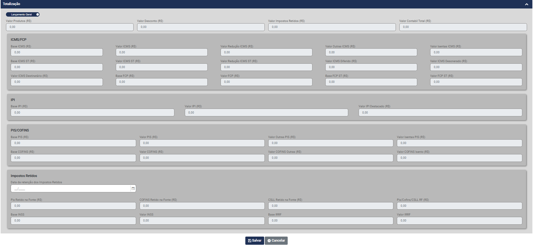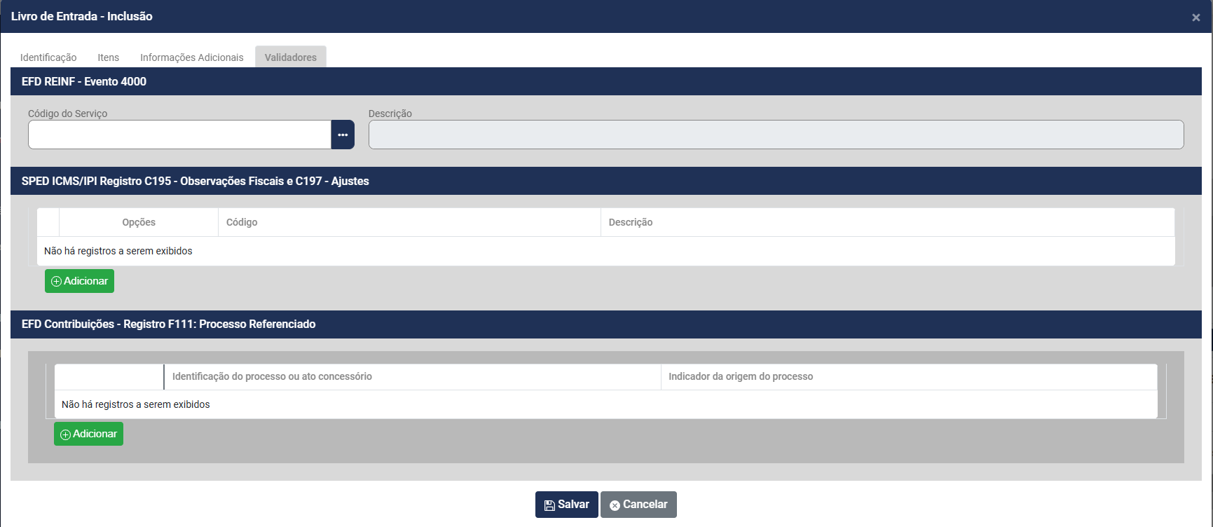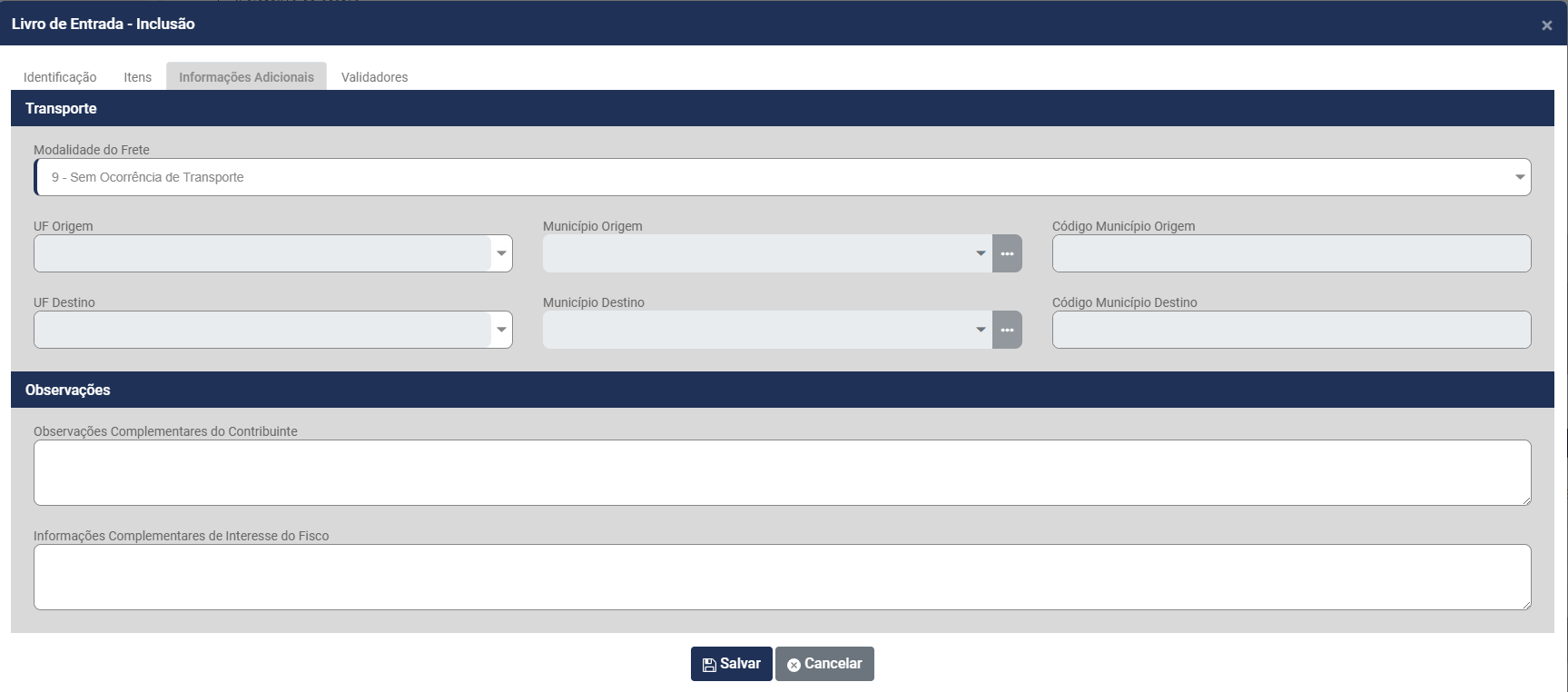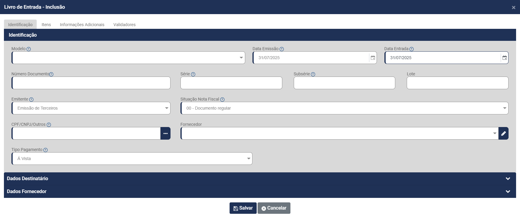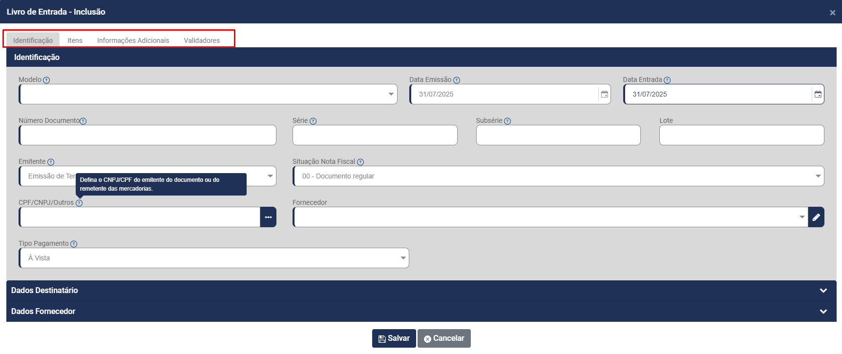 Ao acessar o Botão, o Sistema apresentará a tela para cadastro do Livro Fiscal de Entrada de Mercadorias e Serviços, com as abas