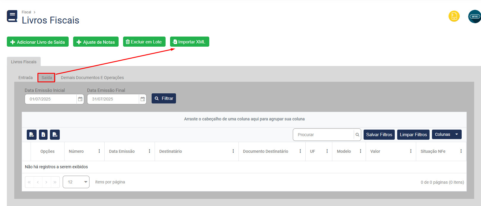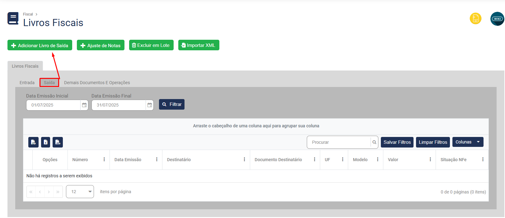 Ao acessar a Aba Saída será apresentada na parte superior da tela os botões
