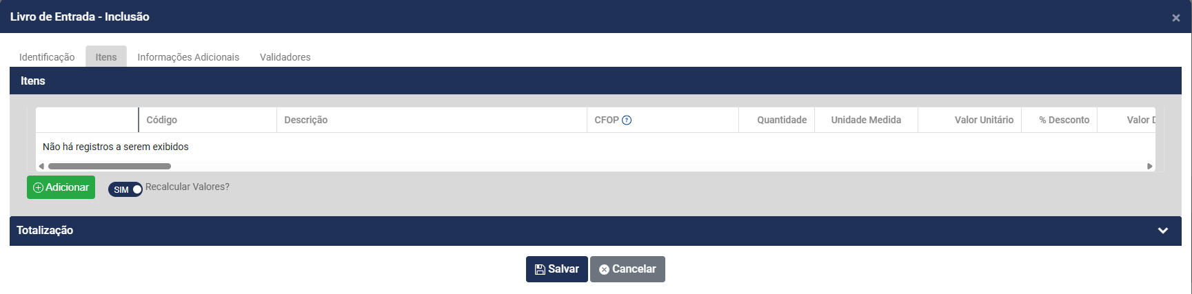 Em Itens, informe os dados dos Itens de Entrada, através do botão Adicionar e a Totalização