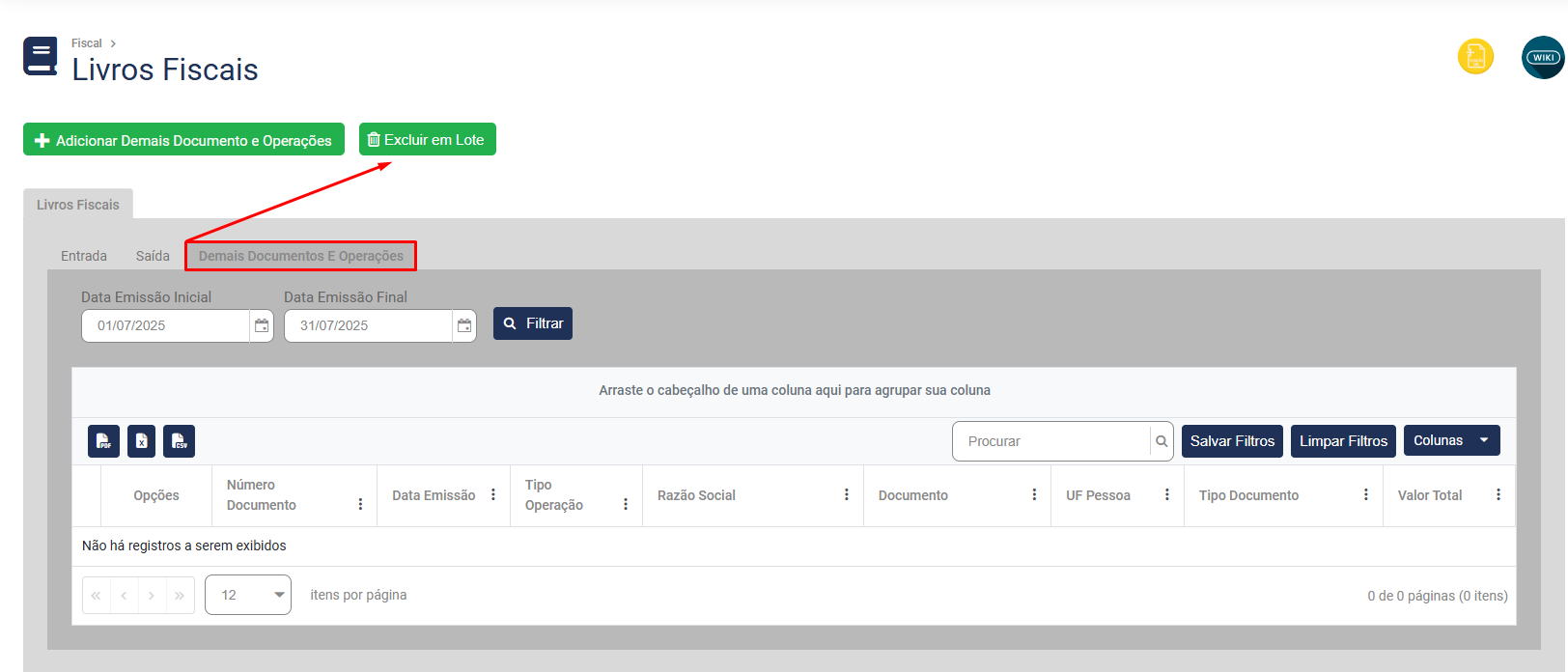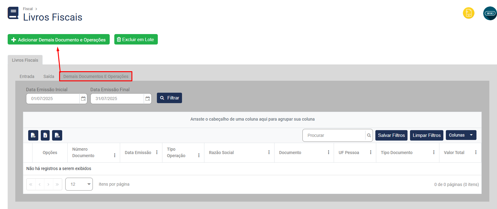 Cadastro dos Livros Fiscais (Entrada, Saída, Demais Documentos e Operações)