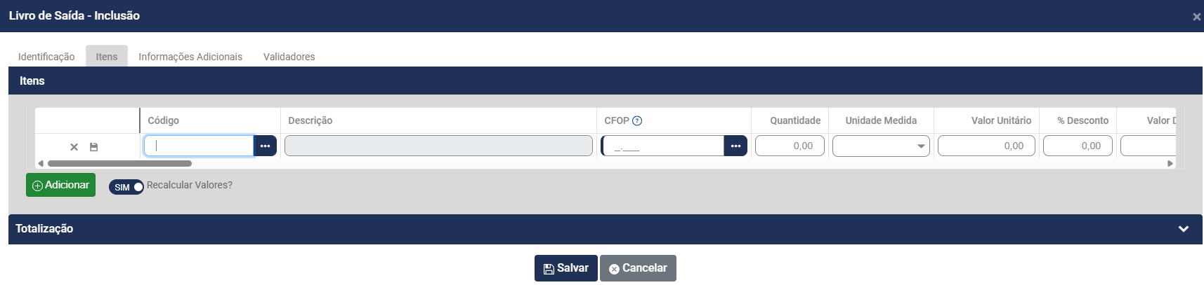 Em Itens, informe através do botão Adicionar, os dados dos Itens de Saída e a Totalização